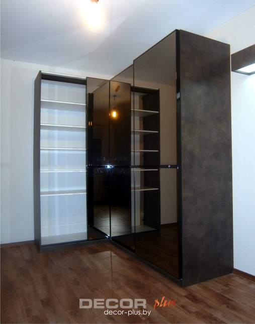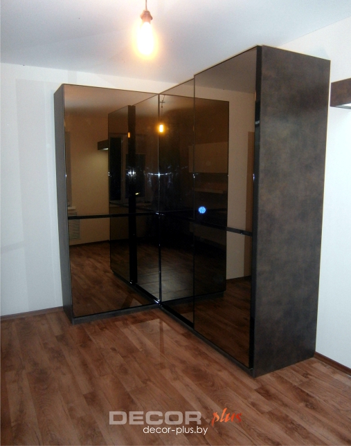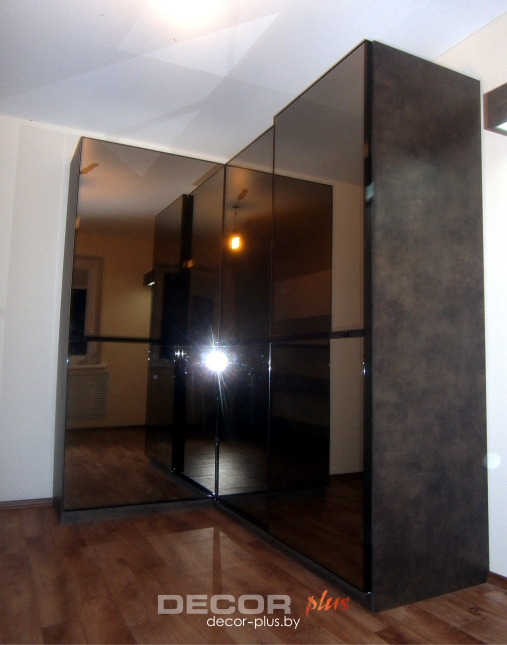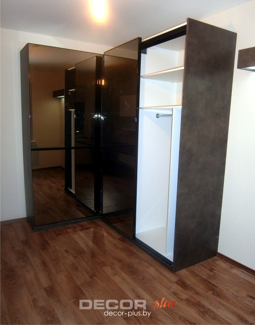 код 85097Угловой шкаф-купе с бронзовым зеркальным фасадом. Корпус в коричневых тонах.