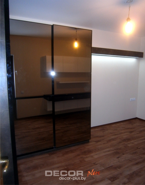 Угловой шкаф-купе с зеркальным тонированным фасадом в две и одну створку на каждой стороне соответственно. Скрытый профиль, фасад с горизонтальным зазором по центру, корпус ламинирован в коричневых тонах под кожу.