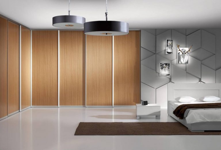Встроенный угловой шкаф-купе для просторного гардероба. Интенсивная расцветка фасада под древесину клена гармонично сочетается с серебристым профилем. Наполнение может варьироваться в зависимости от предпочтений заказчика.
