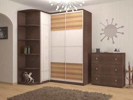 Шкаф угловой №24 представлен в изысканном стиле, идеально подходящем под интерьер вашей комнаты. Корпус шкафа окрашен в насыщенный коричневый цвет. Фасады выполнены в комбинации белого цвета и цветных панелей под дерево. Модель оснащена множеством боковых полок большой размерности, на которые можно поставить разные мелочи и аксессуары.
