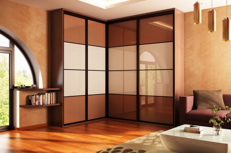 Угловой шкаф-купе с крышкой в формате 2х2. Глянцевый фасад представляет собой горизонтальную комбинцию лакомата двух цветов: белый по середине и бежевый по краям. Фасад разделен темными перегордками на прямоугольные панели.