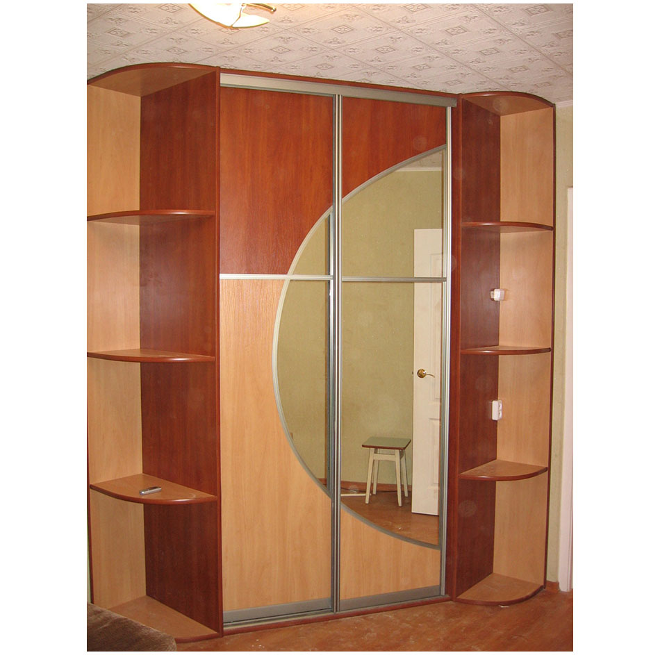 Шкаф-купе с боковыми полками выполнен в теплой цветовой гамме. Зеркальная створка исполнена в оригинальной дугообразной форме, с окаймлением в виде стильных алюминиевых планок. Боковые полочки расположены по обе стороны шкафа, обеспечивая большее пространство под различные сувениры и аксессуары.