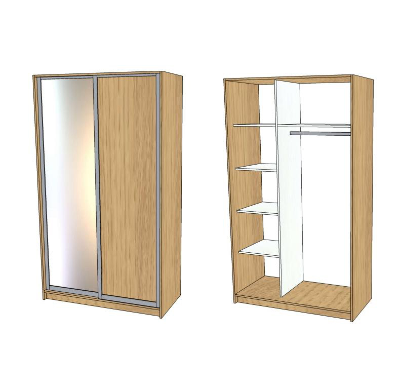 Современный корпусный шкаф-купе. Снаружи изготовлен из ДСП ( на выбор 3 цвета) внутри ДСП белого цвета (Egger). Отделка кромкой ПВХ . Раздвижная система Senator.