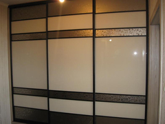 Шкаф-купе выполнен со светло-коричневыми фасадами. Одна из створок шкафа выполнена из лакомата в алюминиевом профиле. Лакомат отличается своей устойчивостью к мелким механическим повреждениям.
