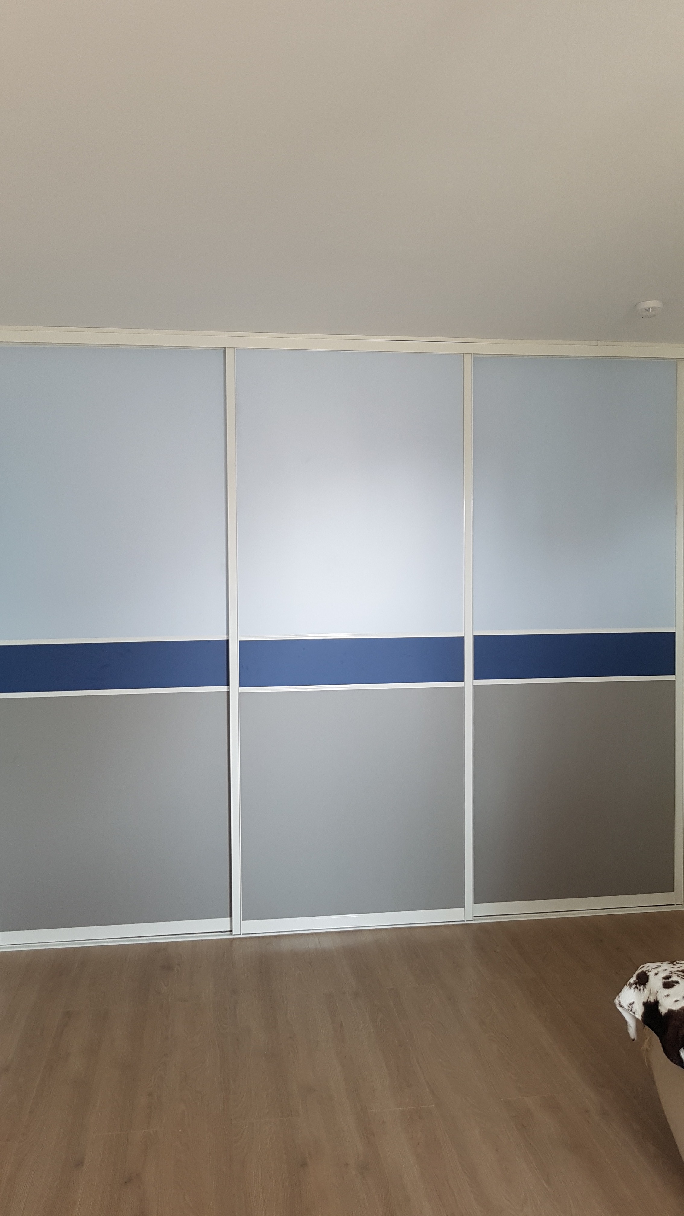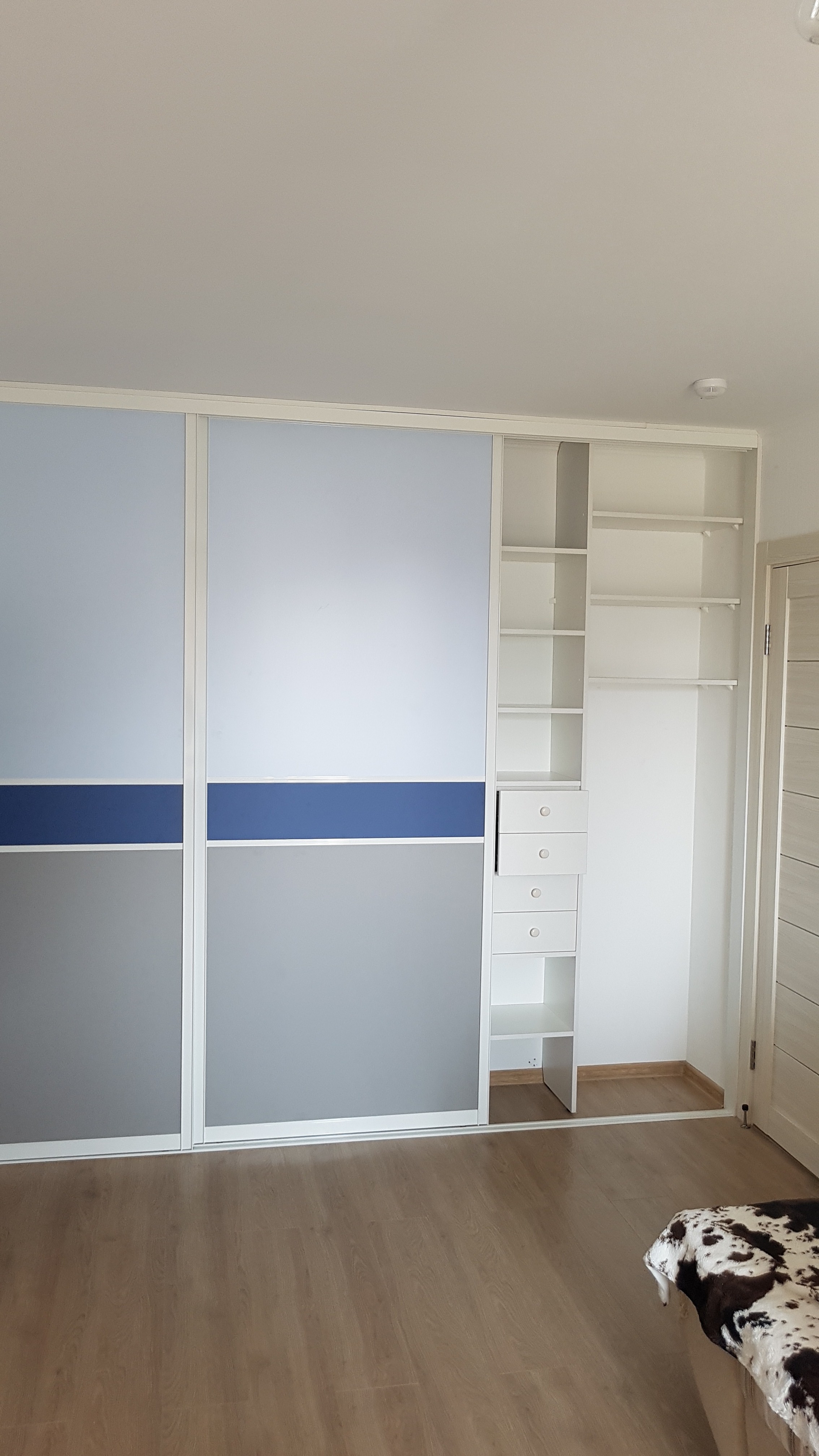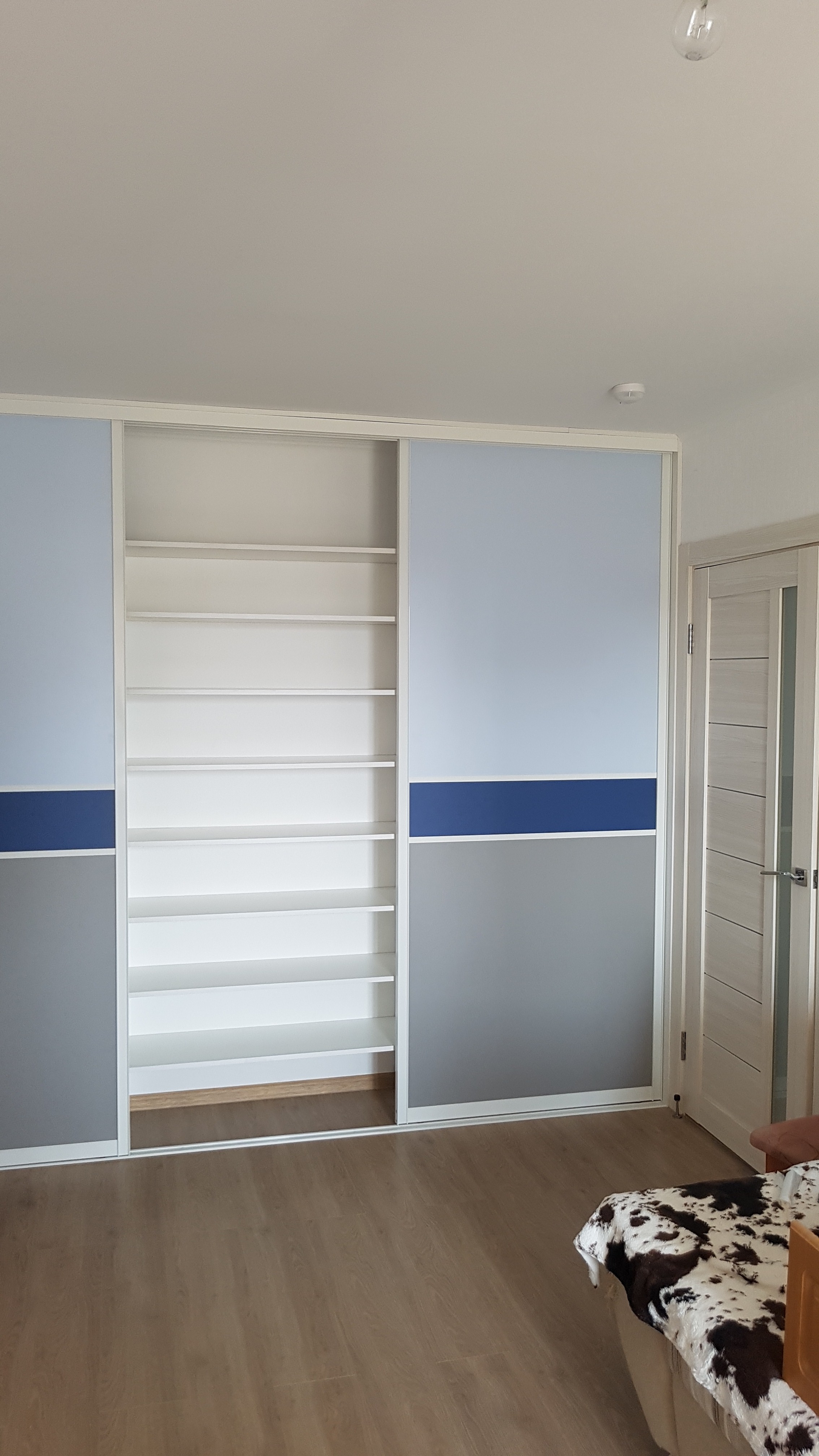Шкаф-купе с профилем под имитацию белой кожи. Створки с разделителем.