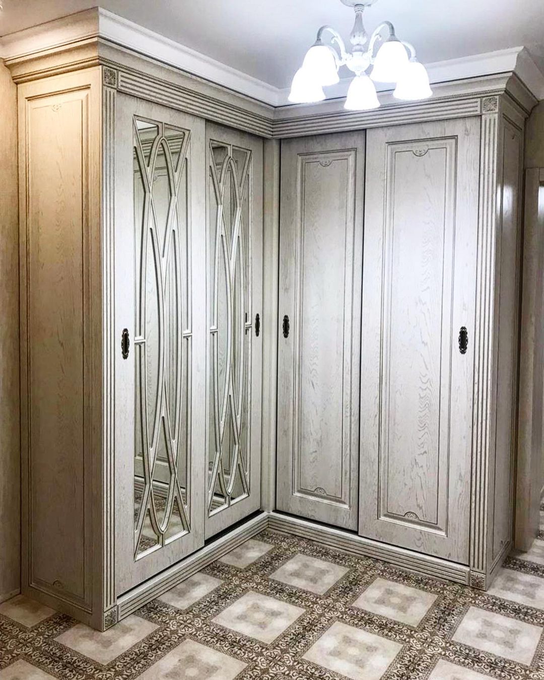 Светлый трехдверный шкаф-купе с зеркалами. Множество полок и отделений для хранения одежды.