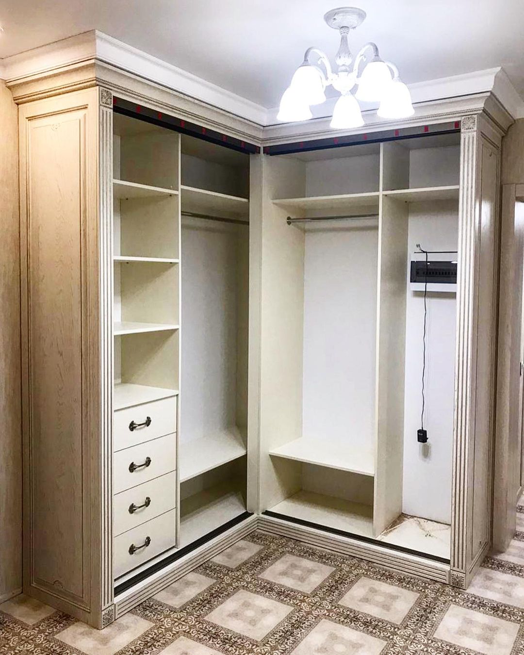 Выполнен в классическом стиле с патиной. Наполнение: полки, штанги, выдвижные ящики.