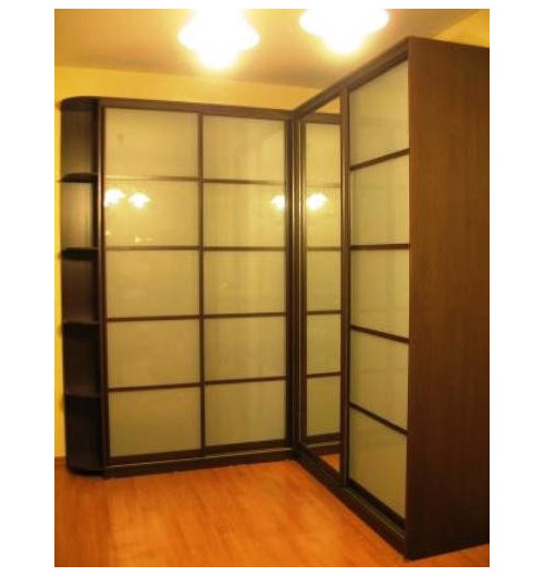 Шкаф-купе представлен в виде угловой конструкции. Внушительные размеры шкафа способствуют размещению в нем большого количества вещей, но не позволят установить шкаф в малогабаритном помещении. Фасады шкафа выполнены в цвете венге.