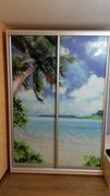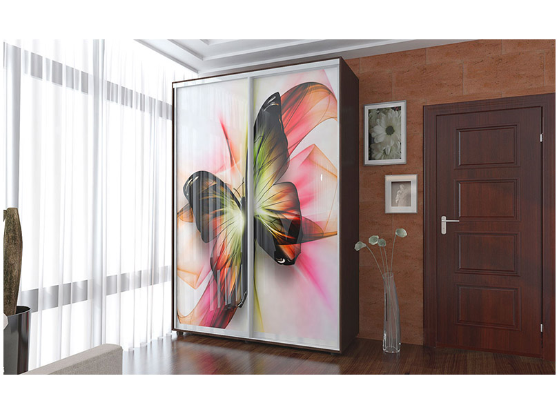 Каркас шкафа белого цвета. Двери из лакобеля и разделены алюминиевыми рейками.