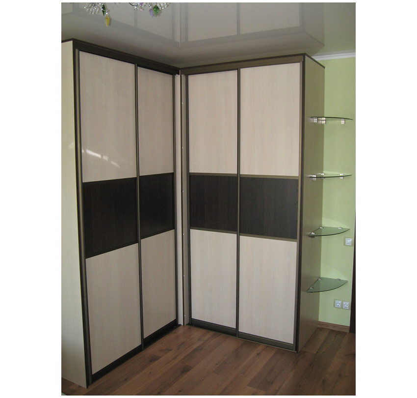 Угловой шкаф-купе с фасадами молочный дуб, венге и стеклянными боковыми полками