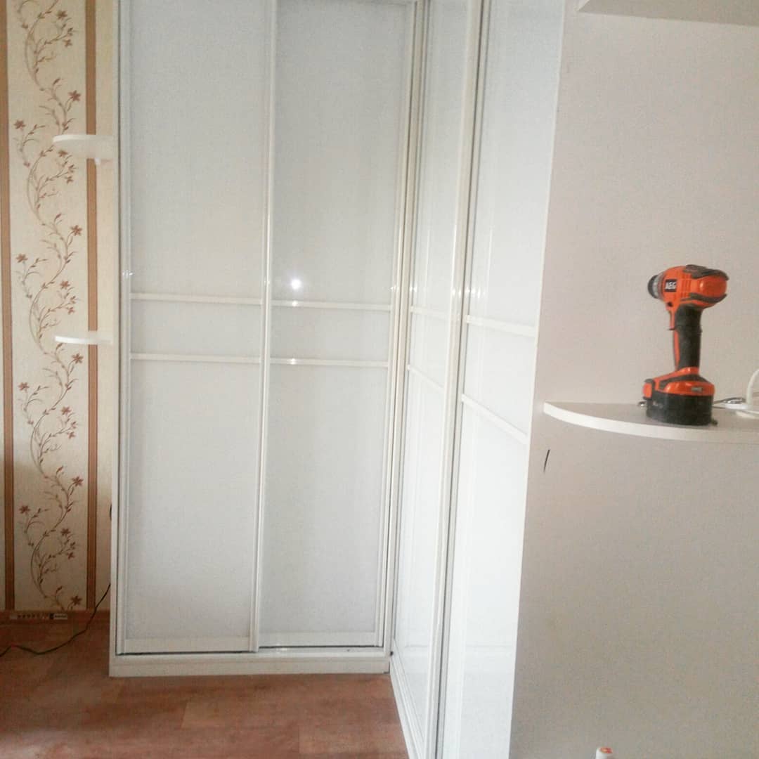 Угловой белый шкаф-купе с глянцевыми фасадами и боковыми полками.