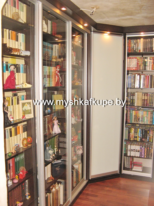Угловой шкаф-купе библиотека со встроенной в козырек подсветкой. Узкие высокие створки в серебристом профиле изготовлены из прозрачного стекла, скрывающего книжные стеллажи. Диагональный угол с дверцей из белого непрозрачного материала. Корпус под темный орех.