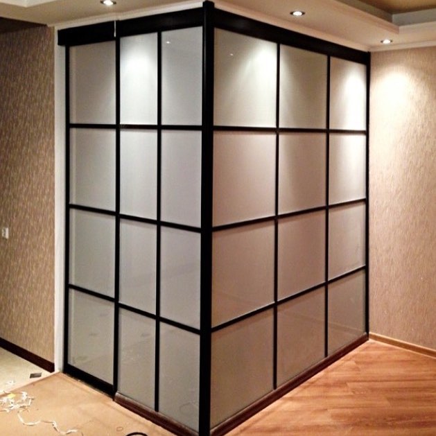 код 116317Шкаф с черным металлическим профилем и стеклянными вставками. Изготавливается по индивидуальным размерам.