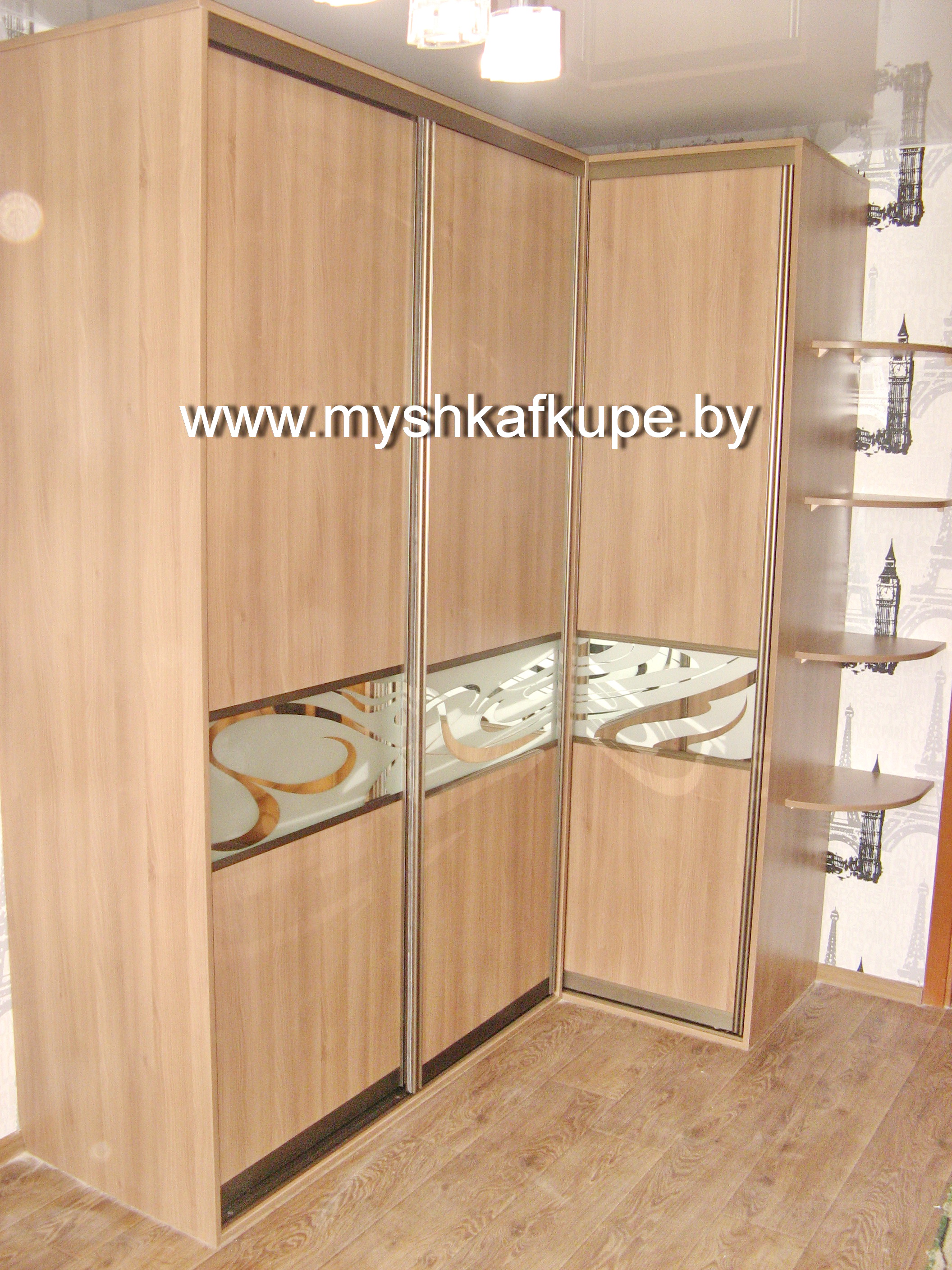 Фасад: зеркало пескоструй, ДСП под светлое дерево.