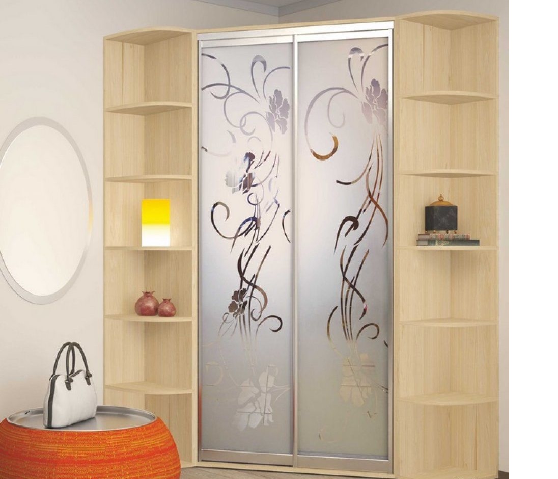 Угловой шкаф-купе декорирован абстрактным пескоструйным рисункам на створках. Функционал шкафа включает в себя большие боковые полки, на которые можно поставить красивые аксессуары и украшения интерьера. Наполнение шкафа состоит их полочек для одежды и штанги для вешалок с одеждой.
