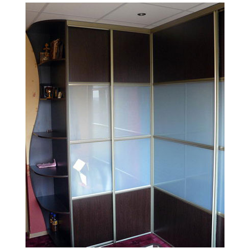 Шкаф-купе характеризуется угловым типом и устанавливается в непосредственно в угол. Фасады шкафа выполнены в цвете венге и имеют волнообразную форму.