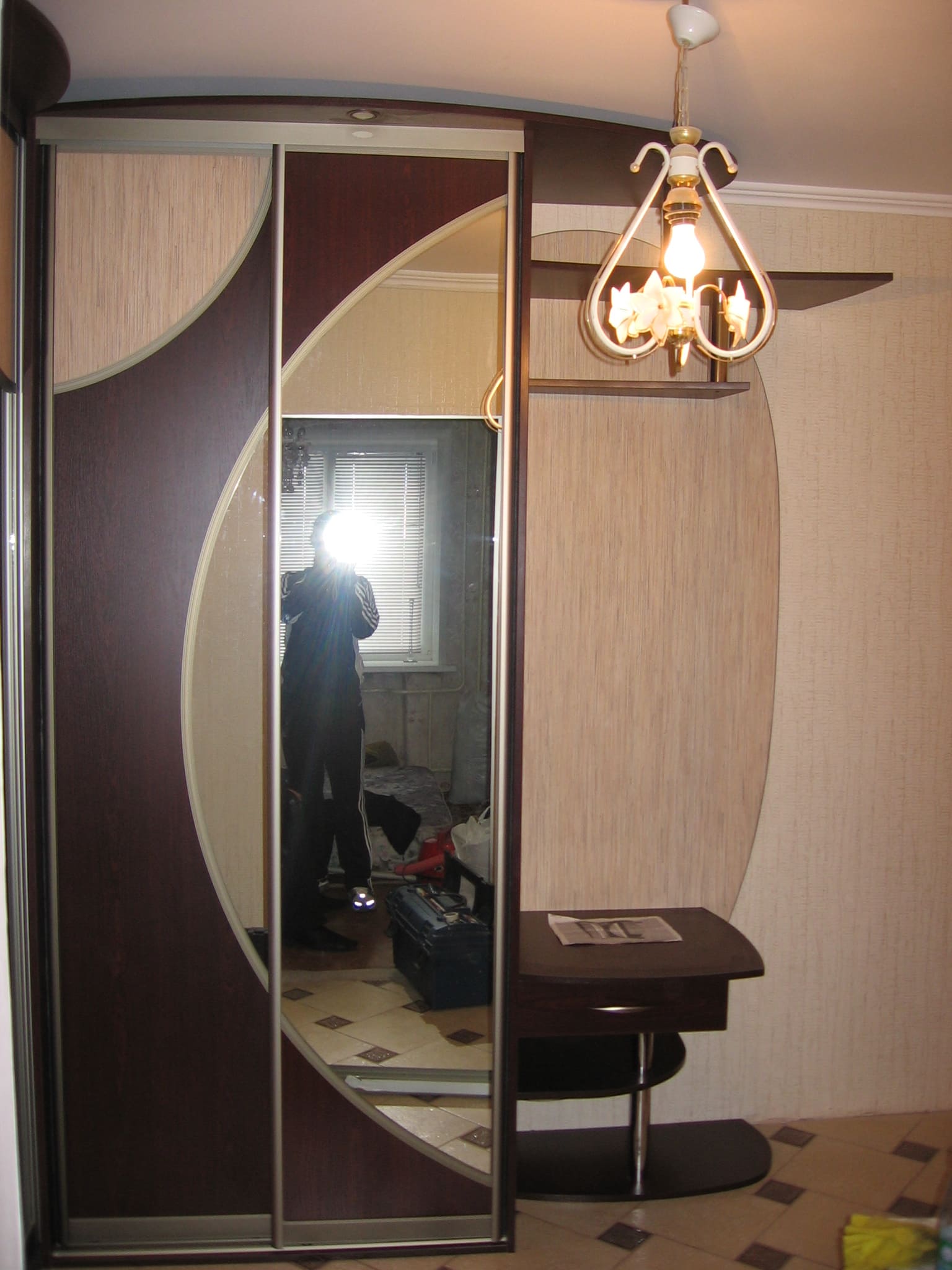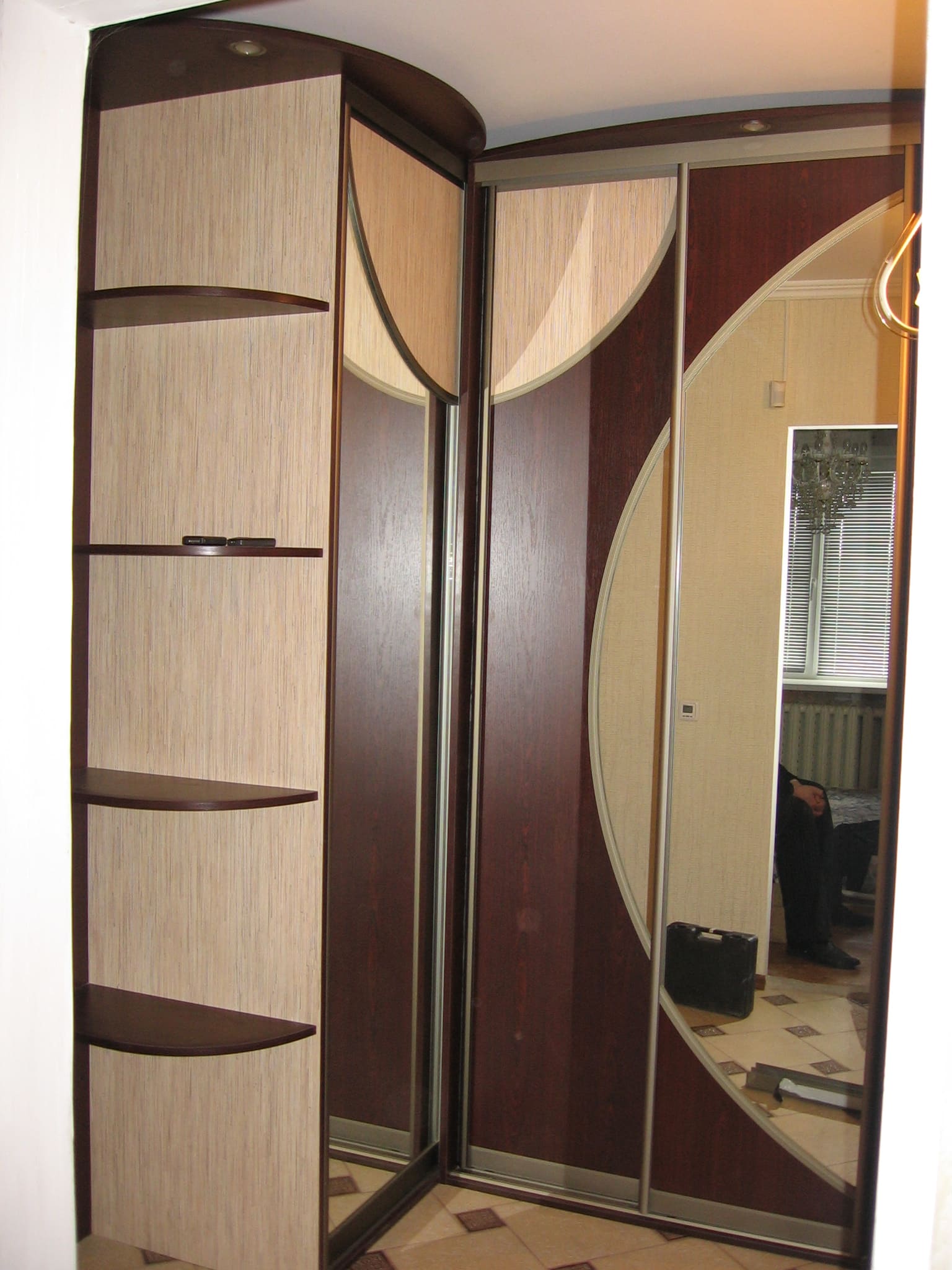 Угловой шкаф-купе с открытыми полками и фигурными зеркалами