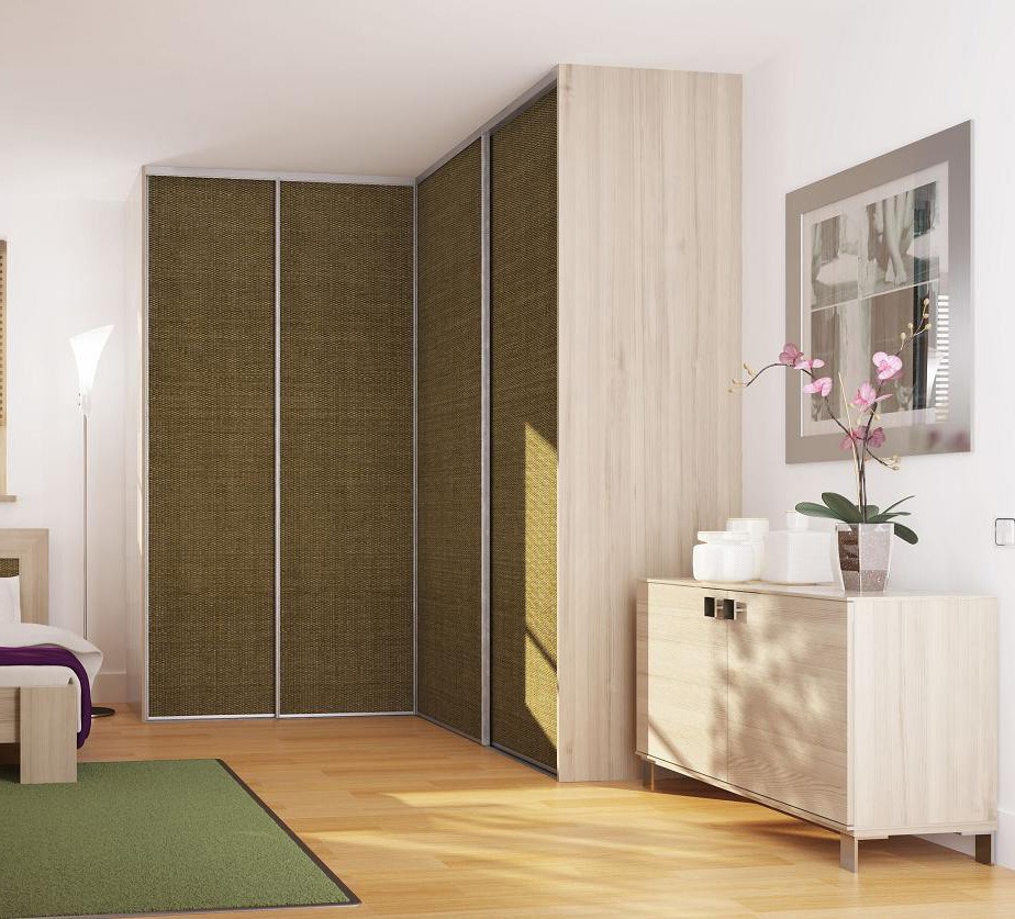 Фасад представляет собой плетистую фактуру наподобие папирусной или ротанговой циновки бежево-палевого цвета в алюминиевом профиле. Корпус выполнен под светлое дерево с незамысловатым рисунком древесины. Что касается внутреннего наполнения и размеров углового шкафа-купе, то они могут быть выполнены на заказ и дополнены самыми разнообразными полками и выдвижными ящиками.