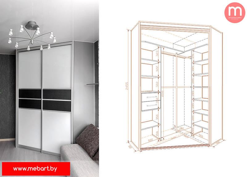 Угловой шкаф-купе отличается стильным внешним видом. С одной стороны модель укомплектована двумя раздвижными створками бежевого цвета, а с другой дверцы украшают зеркальные вставки с оригинальным пескоструем. Для придания большей функциональности шкаф оснащен боковыми полочками открытого типа.