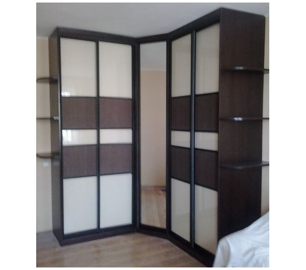 Белый глянцевый фасад углового шкафа-купе дополнен очень интересными и необычными вставками коричневого цвета с инкрустацией под натуральную ткань. Такое сочетание делает внешний вид модели очень стильным современным. Для максимального удобства на торцах установлены небольшие полочки со срезанными углами.