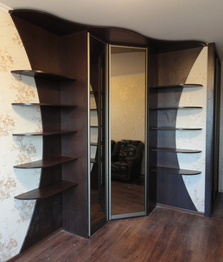 Двухдверный шкаф купе с десятью угловыми полками открытого типа украсит вашу комнату, а также позволит с большим удобством и комфортом разметить большое количество мелких вещей, элементов декора, а также небольшую домашнюю библиотеку. Конструкция не займет в помещении слишком большую площадь, обеспечив вас дополнительным местом для хранения одежды и других предметов.
