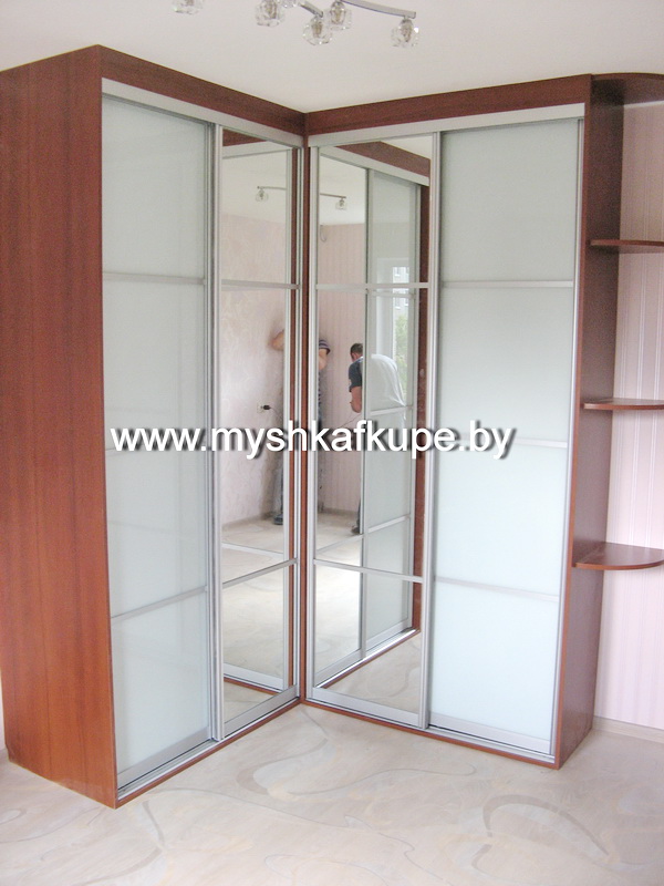 Аккуратный угловой шкаф-купе 2х2 в корпусе под темное дерево с зеркальными створками по середине и белыми глянцевыми по краям. Фасад разделен серебристыми перегородками на квадраты. В торце расположены округлые полки.