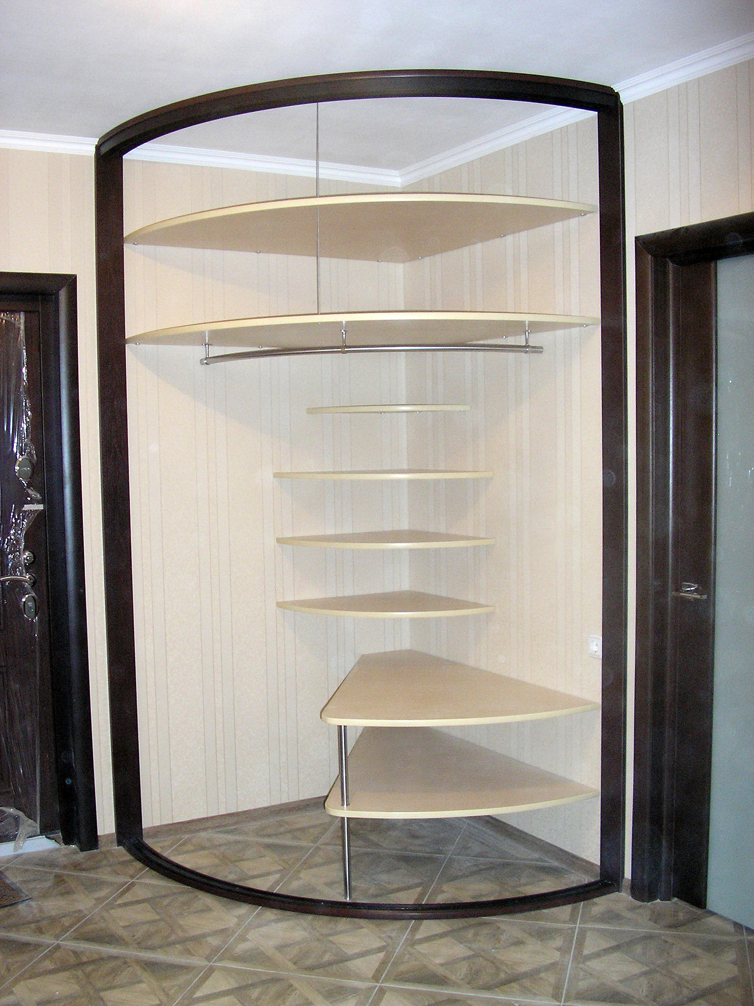 Вместительный и практичный радиусный шкаф-купе обладает удобным и современным функционалом, с обилием полочек разных форм и размеров. Основой для части полок служат металлические колонны, небольшие полочки крепятся к стенке.