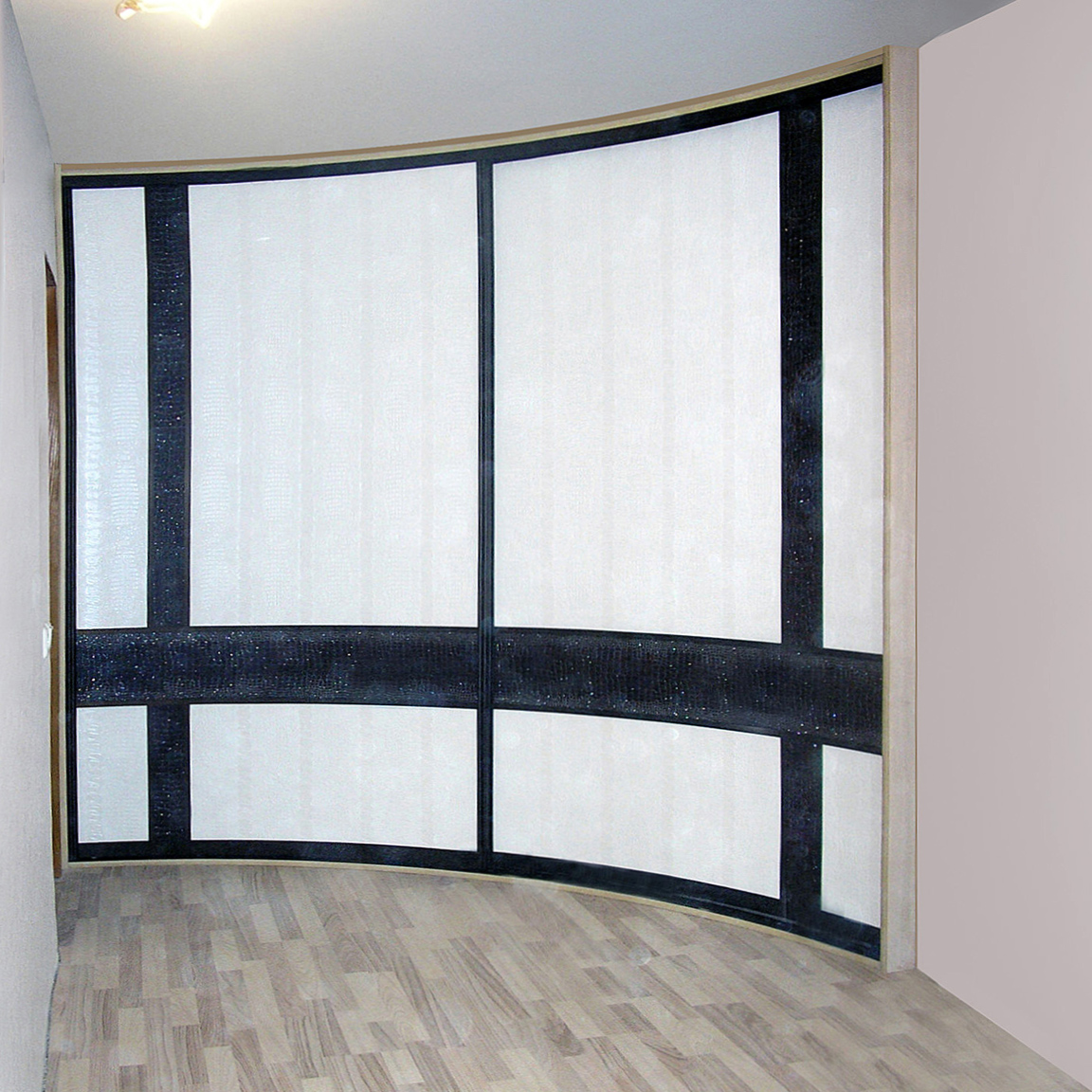 Современный вогнутый шкаф-купе позволяет сэкономить место в комнате за счет оригинальной конструкции. Фасад модели белый, с едва уловимыми стильными полосами. Отличительной особенностью шкафа является креативная вставка из черной искусственной кожи, придающая шкафу особенный колорит.