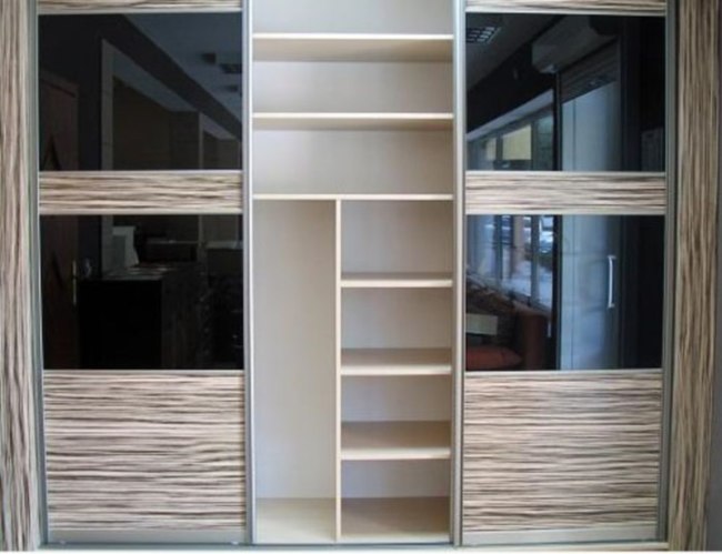 Шкаф-купе разделен на три секции. Центральный сегмент поделен на просторные полочки. Такая компановка элементов делает представленный шкаф идеальным вариантом для прихожей комнаты.