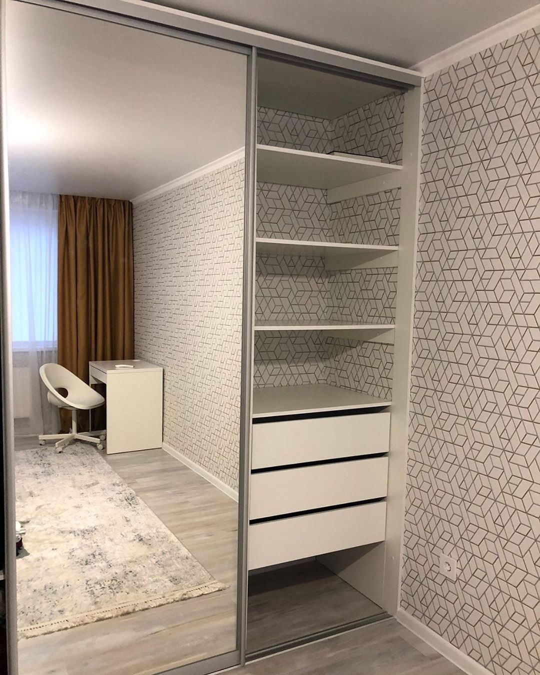 Двери без зеркал, стеллаж с полками справа. Ширина 185 см.