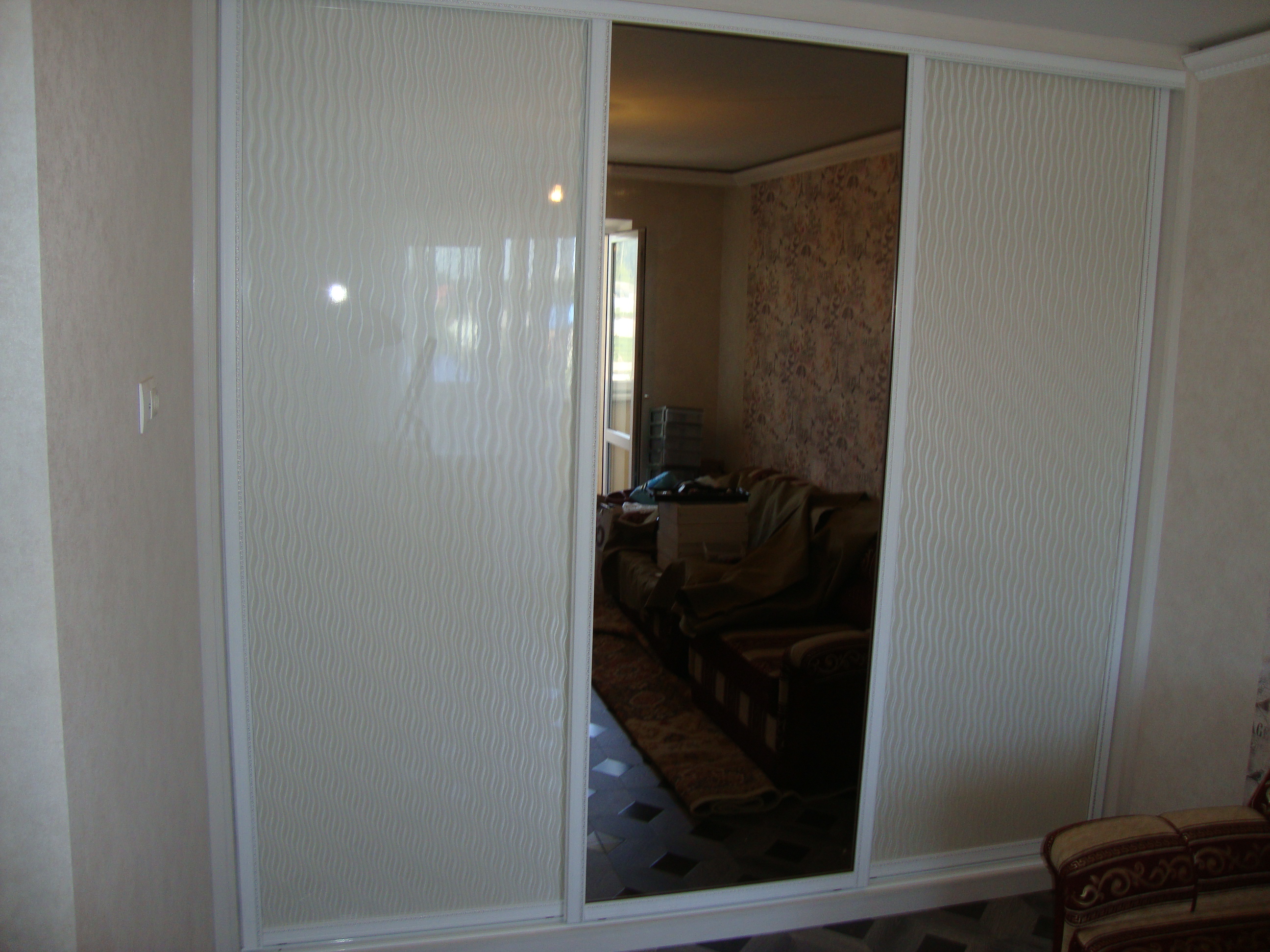 Встроенный в нишу шкаф на три створки отлично впишется даже в небольшую спальню. Центральная створка полностью зазеркалена, две крайние выполнены из непрозрачного лакобеля кремового цвета с волнистой 3D фактурой. Обрамляет дверцы матовый белый профиль с золотистым тисненым узором. Шкаф-купе расположен на небольшом подиуме и имеет удобное наполнение.
