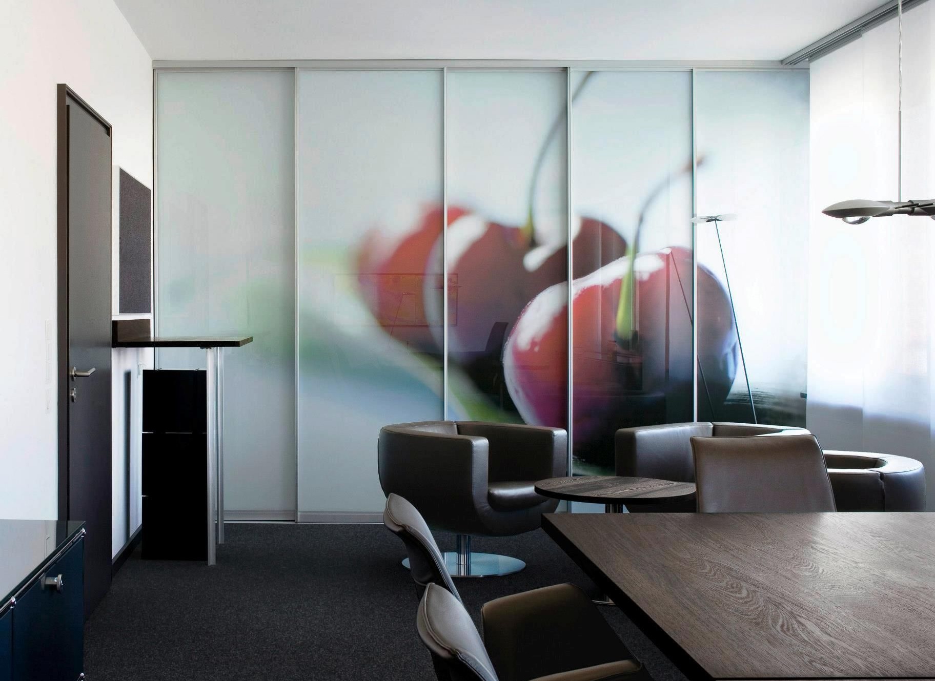 Встроенный линейный шкаф-купе отличается ярким дизайном створок, выполненными в цветной фотопечати с изображением вишни. Яркая и необычная отделка помогает создать более позитивную атмосферу в помещении, а стильная отделка из тонких металлических планок делает конструкцию визуально более легкой. Модель шкафа имеет пять раздвижных створок с современными бесшумными механизмами раздвижения.