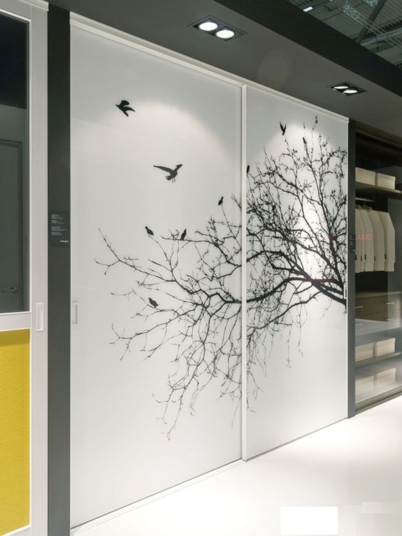 Встроенный шкаф-купе с рисунком дерева на белом фасаде