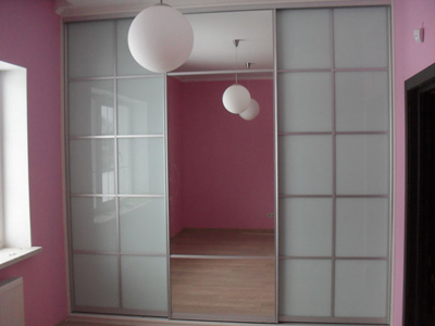 Фасады шкафа декорированы вставками лакобель, разделенными на квадраты алюминиевым профилем. Шкаф комплектуется высоким прямоугольным зеркалом.