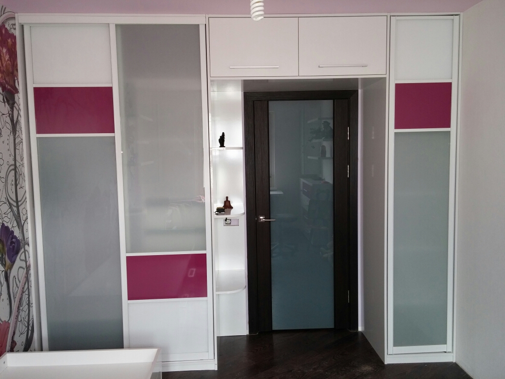 Встроенный шкаф-купе – хороший вариант для малогабаритной комнаты. Модель выполнена в стильном дизайне. Яркий малиновый цвет фасада приглушают белый и вставки из матового стекла.