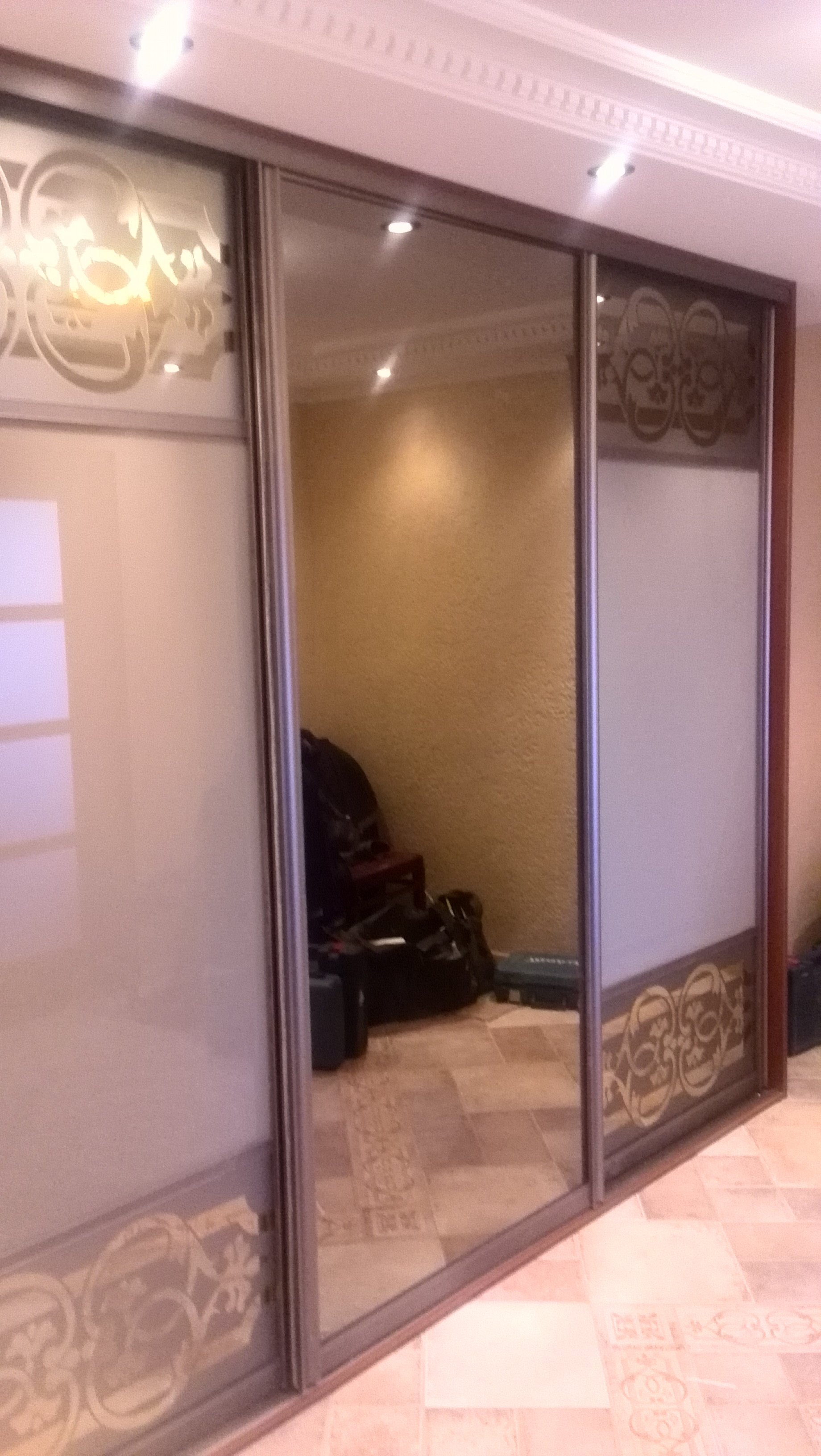 Встроенный шкаф-купе является идеальным местом для хранения большого количество вещей. Габаритная конструкция имеет современный дизайн, который позволяет ей гармонично вписываться в большинство современных интерьеров. Створки выполнены в виде зеркал с нанесенным художественным рисунком и полупрозрачными вставками.