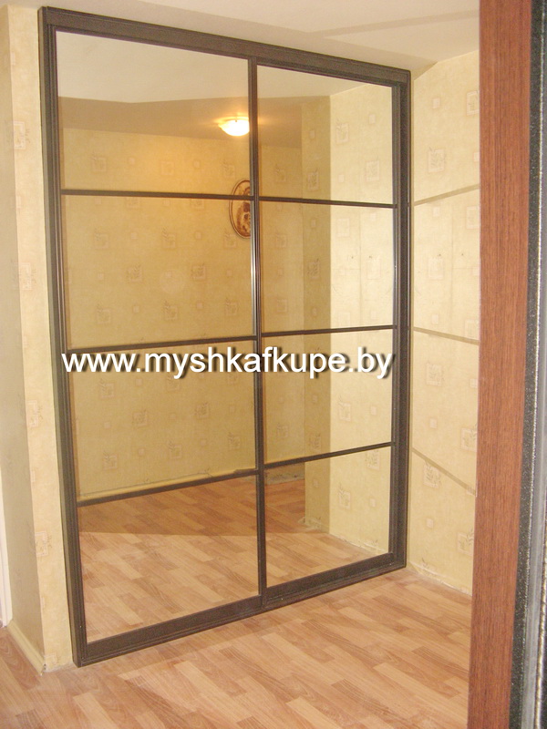 Встроенный в нишу двустворчатый шкаф-купе изготовлен с зеркальным фасадом, рассеченным на равные прямоугольники перегородками темно-коричневого цвета (коньяк) в тон профилю.