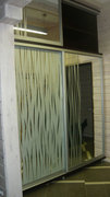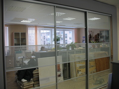 Черный профиль, фасады зеркальные с пескоструйным узором.