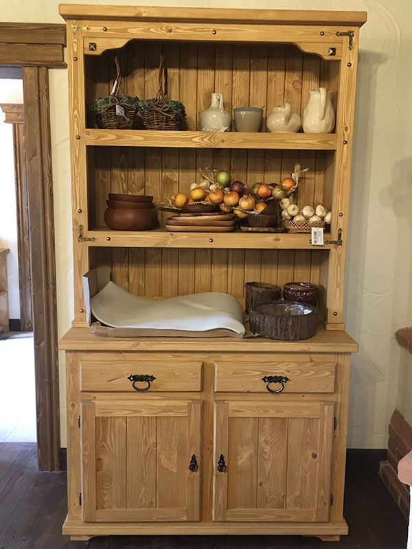 Деревянный кухонный шкаф с удобными открытыми нишами в верхней части изготовлен из натурального массива в классическом сельском стиле рустика, или как еще называют "кантри". Конструкция представляет собой единое из стеллажа на три ниши над двухдверным комодом с двумя выдвижными ящиками под крышкой.