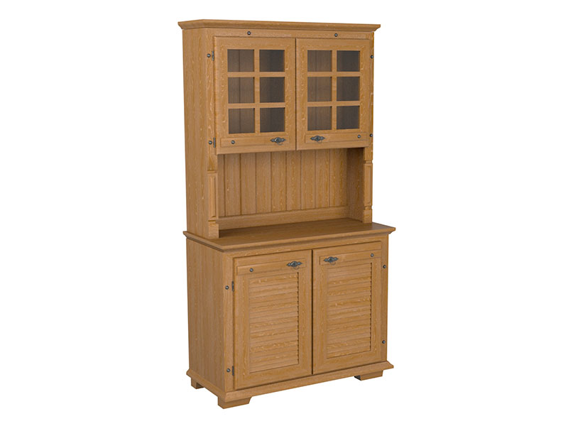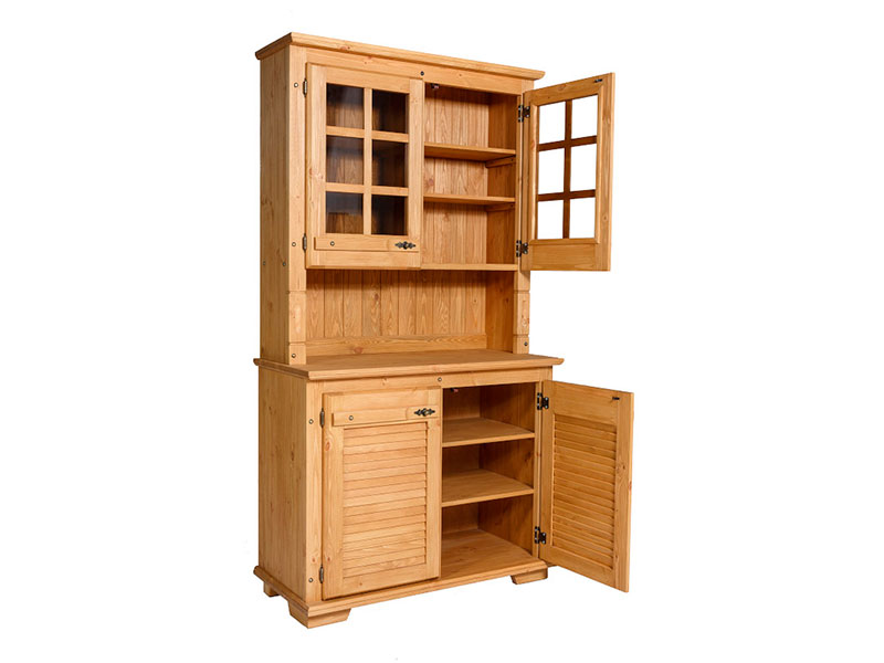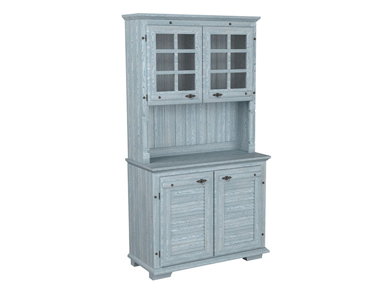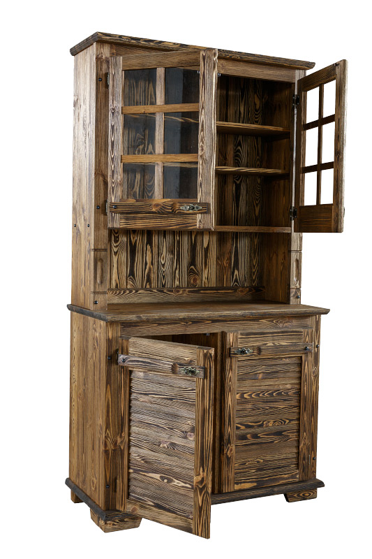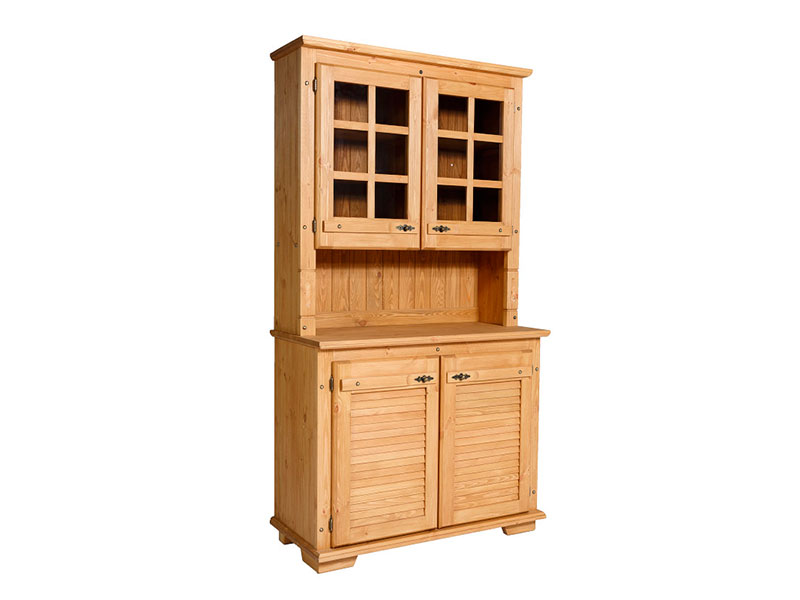 Шкаф для посуды с широкой крышкой и карнизом. Дверцы буфета декорированы деревянным жалюзи и витринами. В нижней части конструкции можно хранить сковороды, принадлежности для уборки и прочие вещи, не требующие каждодневного доступа.