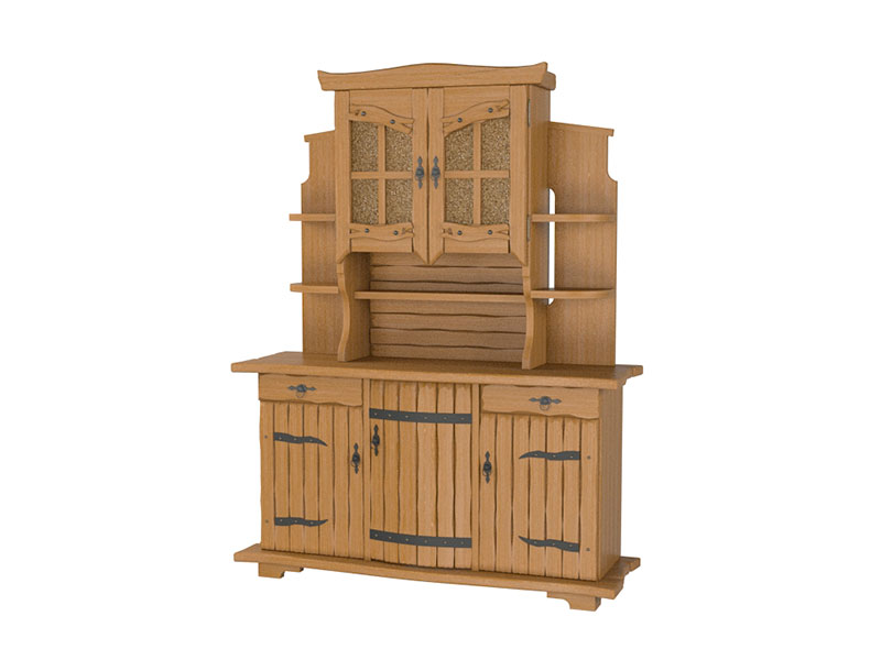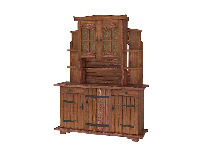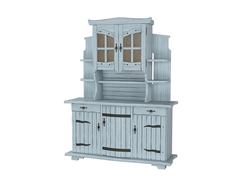 Кухонный комод под старину с витринами и брутальными металлическими ободами и ручками. Верхний шкафчик с витринами.