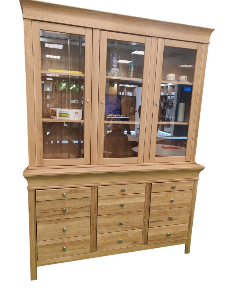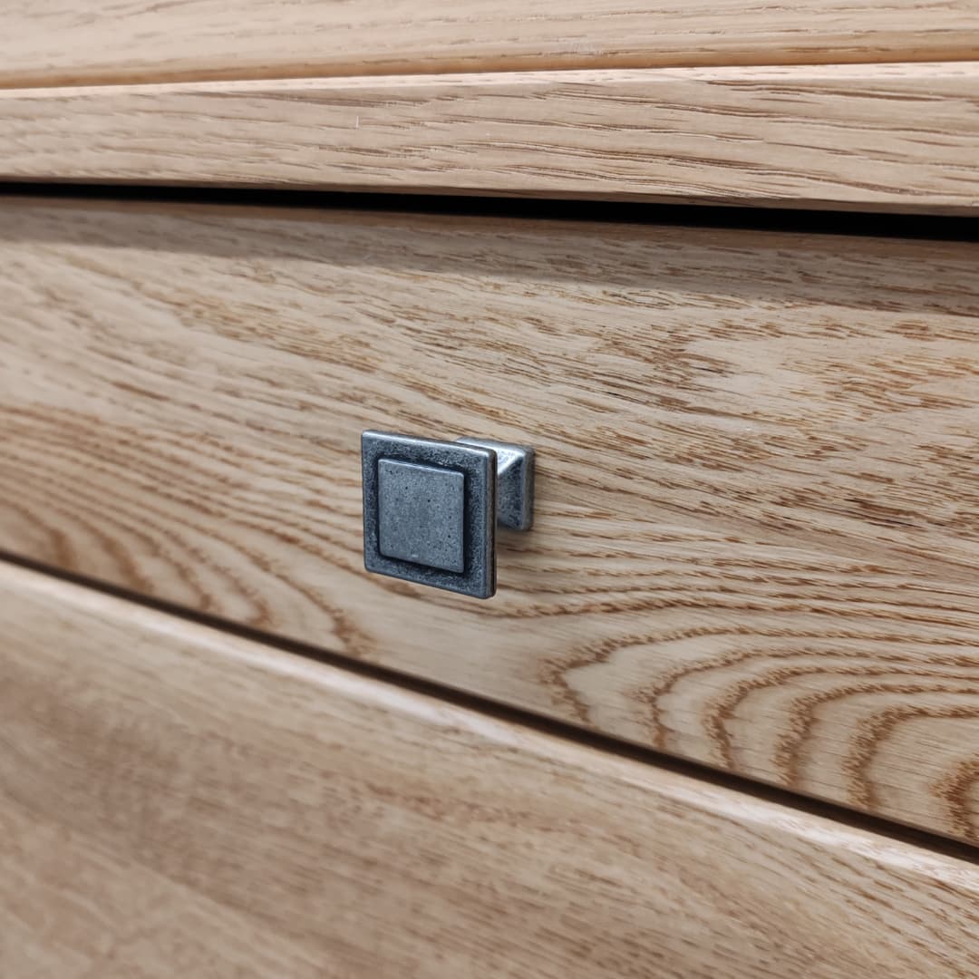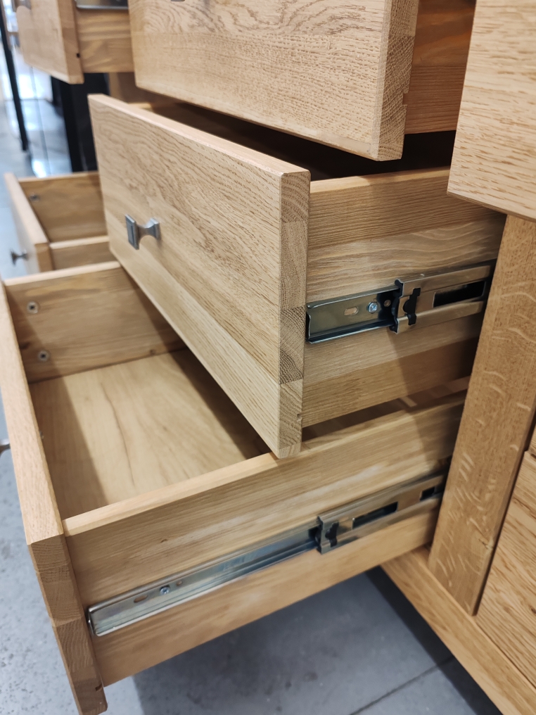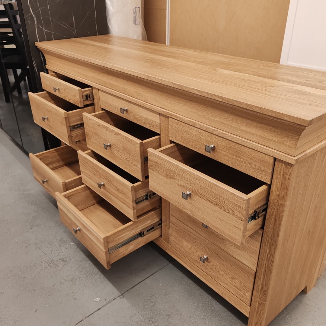Карниз сечением 100х 44 мм . Детали комода выполнены из массива дуба толщиной 18 мм. Дно выдвижного ящика, задняя стенка - HDF Боковые стенки, задние стенки выдвижных ящиков, изготовленные из сосны, окрашенные в цвет дуба. Выдвижные ящики на шариковых направляющих с полным выдвижением.