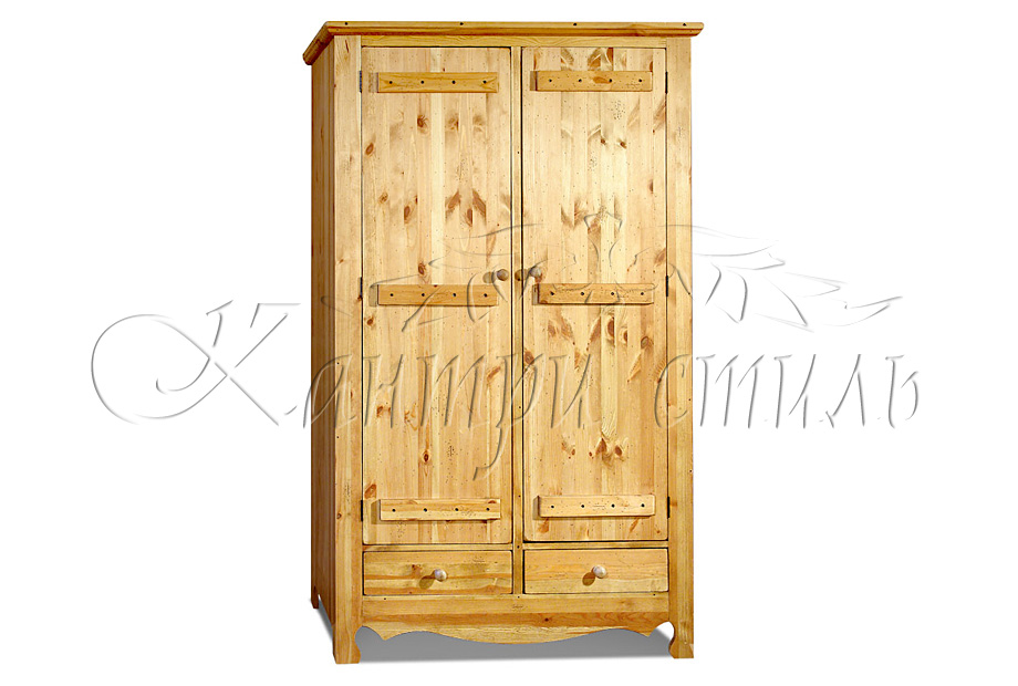 Двустворчатый шкаф в стиле кантри оборудован двумя небольшими выдвижными ящиками внизу. Естественная расцветка. Дверцы и шуфлядки с маленькими круглыми ручками кнопками.