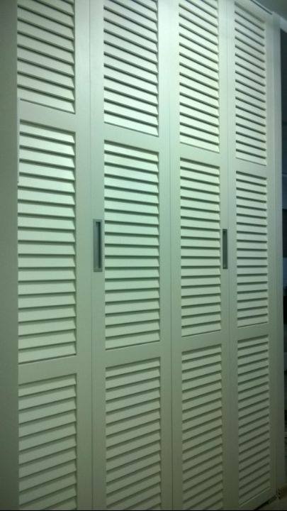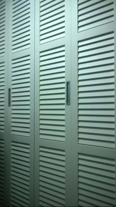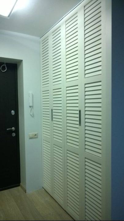 Встроенный гардеробный шкаф на четыре створки оснащен дверными жалюзи с интегрированными ручками. Фасад эмалирован в белый цвет.