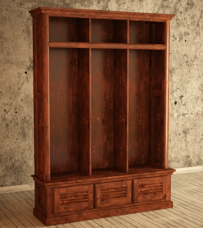 Открытый гардеробный шкаф без дверей для классической прихожей, веранды или раздевалки. Модель выполнена из натурального массива в колеровке под орех. Три высокие ниши вверху разделены перегородкой, создавая тем самым небольшие полки. В нижнем корпусе обустроены три ниши для выдвижных ящиков или на дверцах-жалюзи.