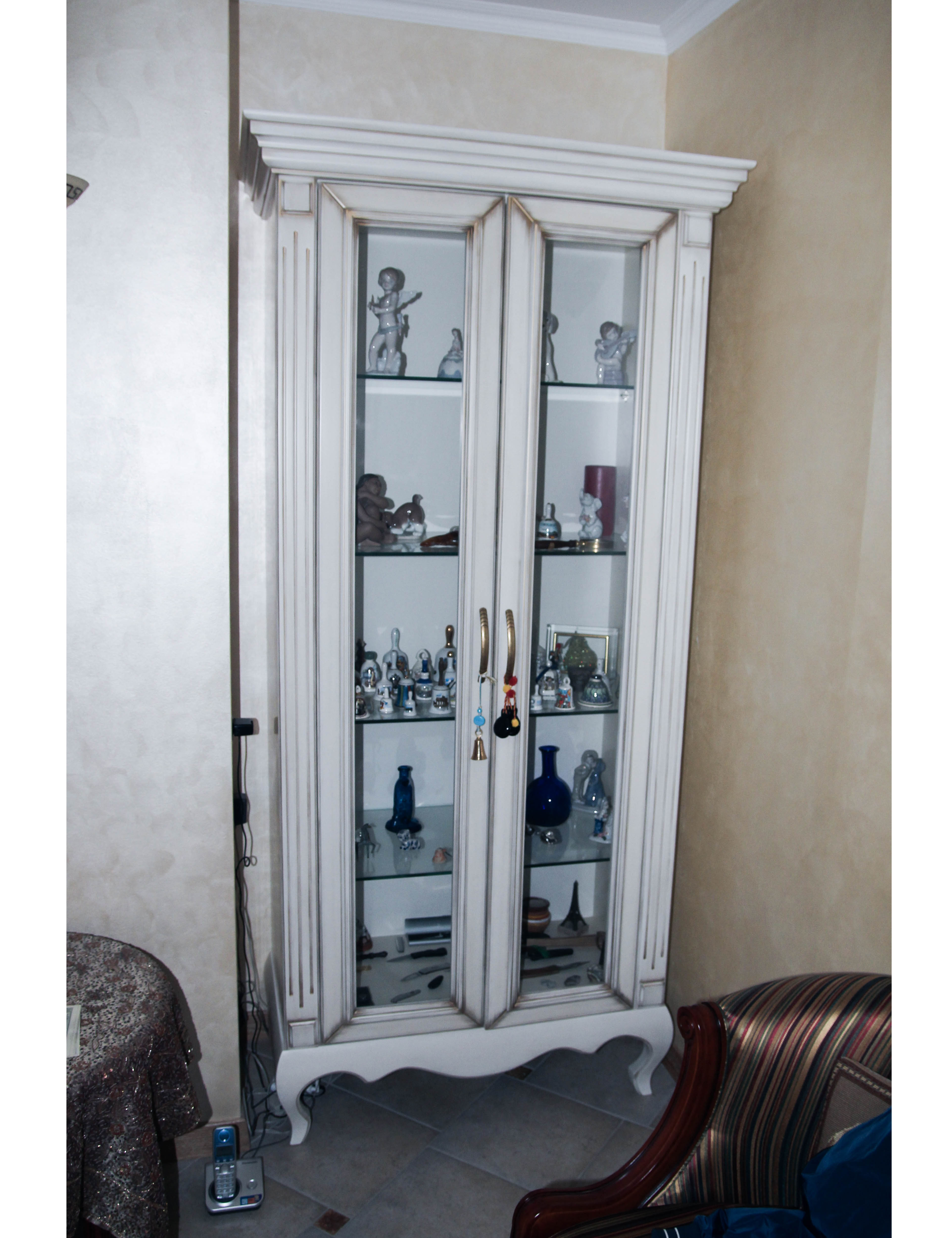 Секция из массива выполнена в классическом дизайне с использованием волнообразных вырезов в оформлении. Массивная верхняя балка придает шкафу впечатление надежности и прочности. Остекленные створки декорированы балками с эффектом старины, для придания секции более креативного вида.