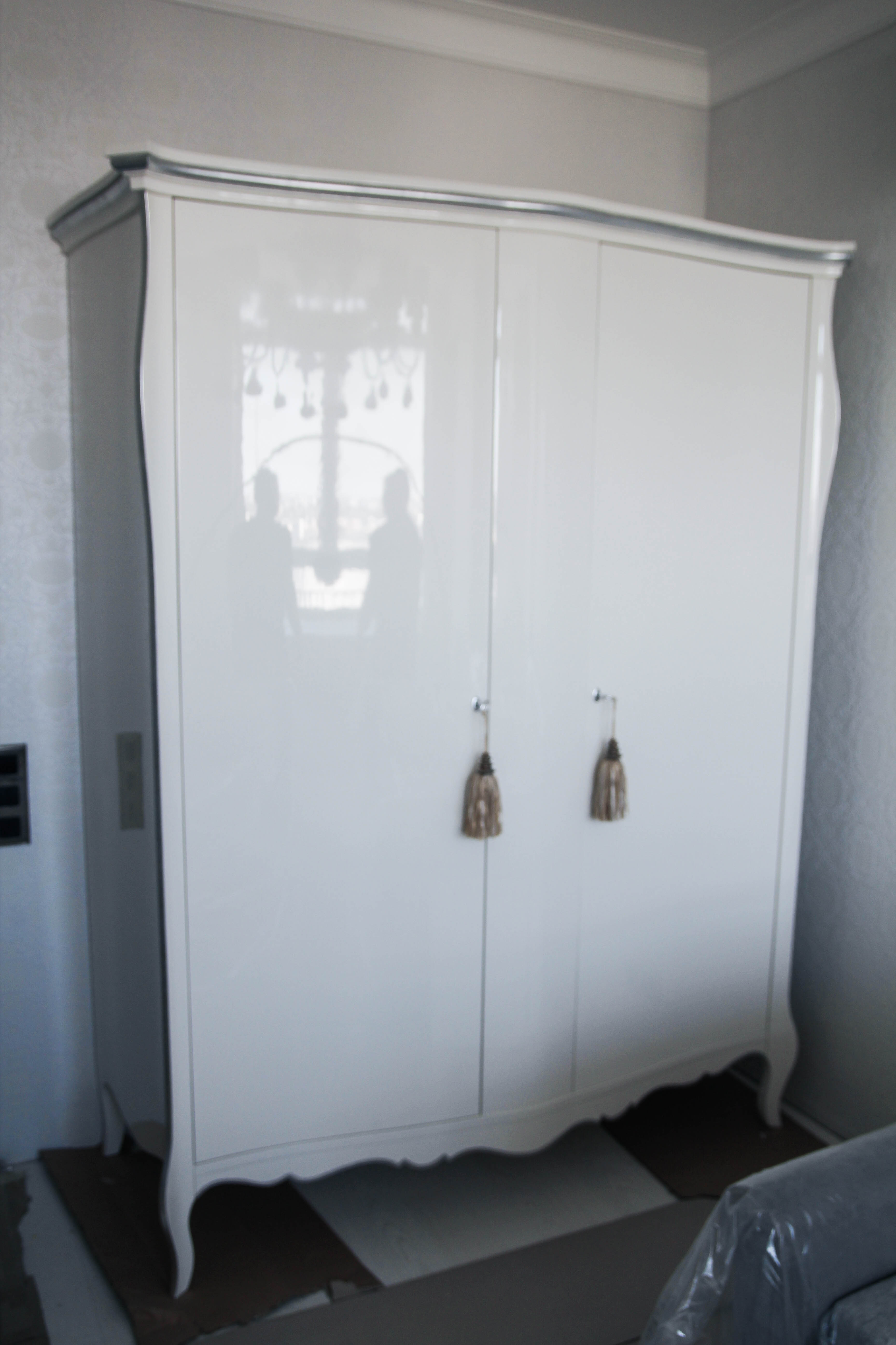 Неординарный белый шкаф с глянцевыми фасадами изготовлен в оригинальном дизайне с применением волнообразных металлических и деревянных планок, для придания шкафу привлекательного внешнего вида. Фурнитура представлена традиционными круглыми ручками.