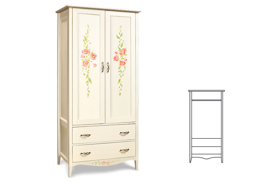 Двухдверный шкаф с изящными ручками и симпатичным рисунком в виде роз на белом деревянном фасаде. Внизу расположены два выдвижных ящика для хранения постельного белья или других необходимых вещей.