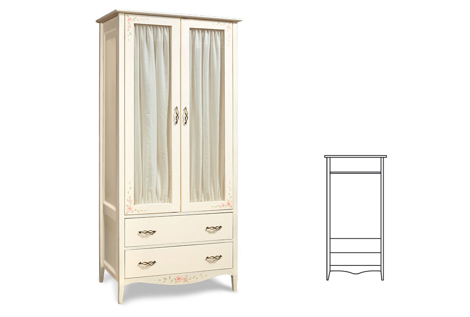 Двустворчатый платяной шкаф с остекленными дверцами в светлом фасаде украшен рисунками в технике декупаж. Под витриной расположены два выдвижных ящика.