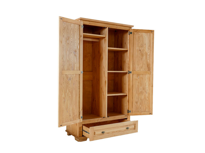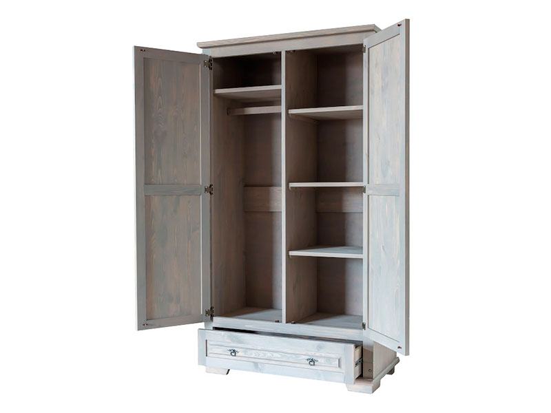Двухстворчатый платяной шкаф оснащен встроенными полочками. В качестве материала изготовления используется лакированный массив сосны. Большой двухдверный распашной платяной шкаф будет достойным украшением гостиной, спальни или жилой комнаты. В сочетании с другими модулями коллекции этот шкаф поможет создать неповторимый интерьер.